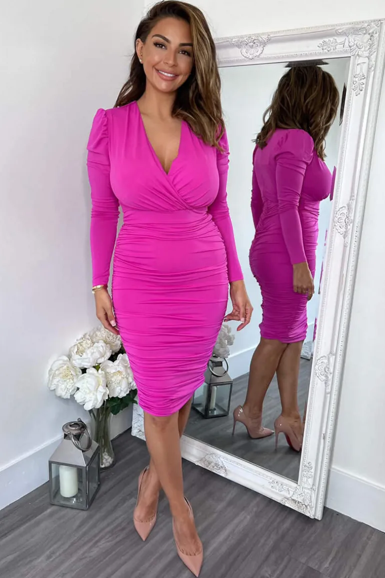 Our Hot Pink Ruched Long Sleeve Cross Front Midi Dress will have you