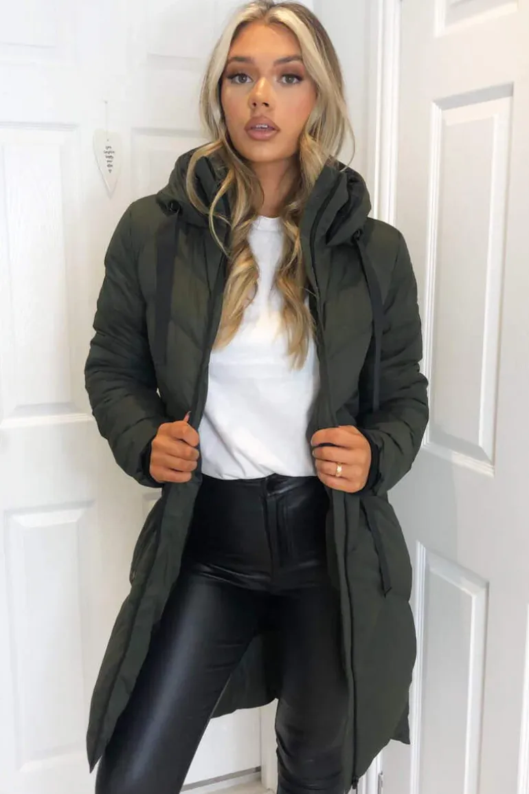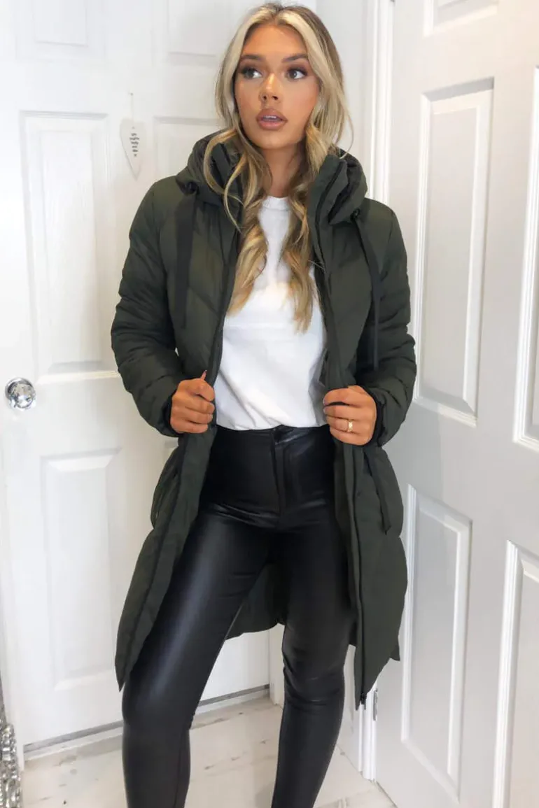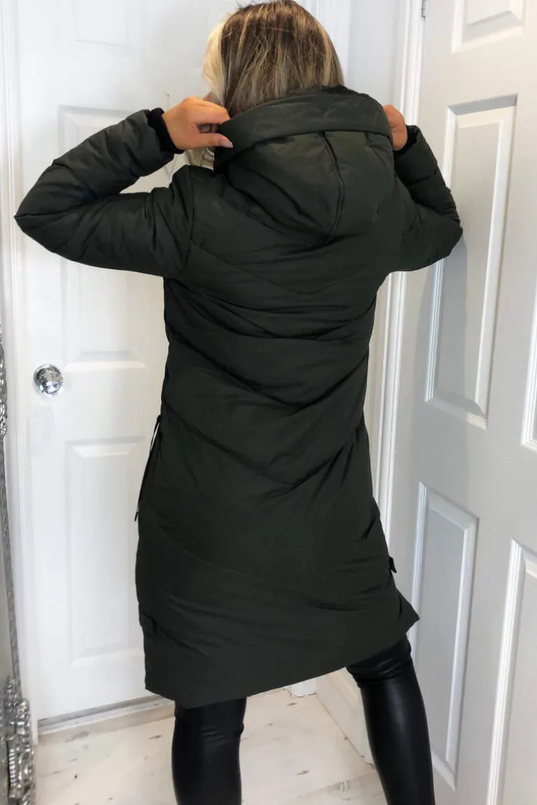 Our Khaki Hooded Long Line Puffer Coat is the essential coat for