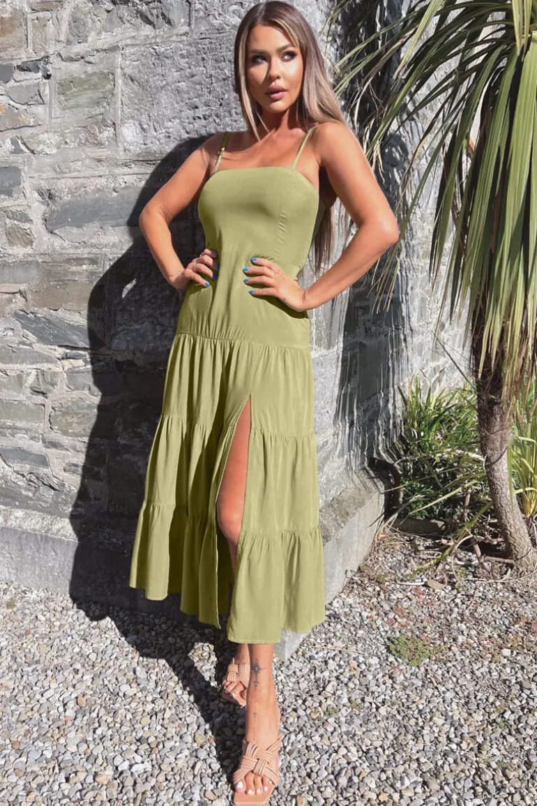 Our Khaki Strappy Smock Midi Dress is essential for your summer