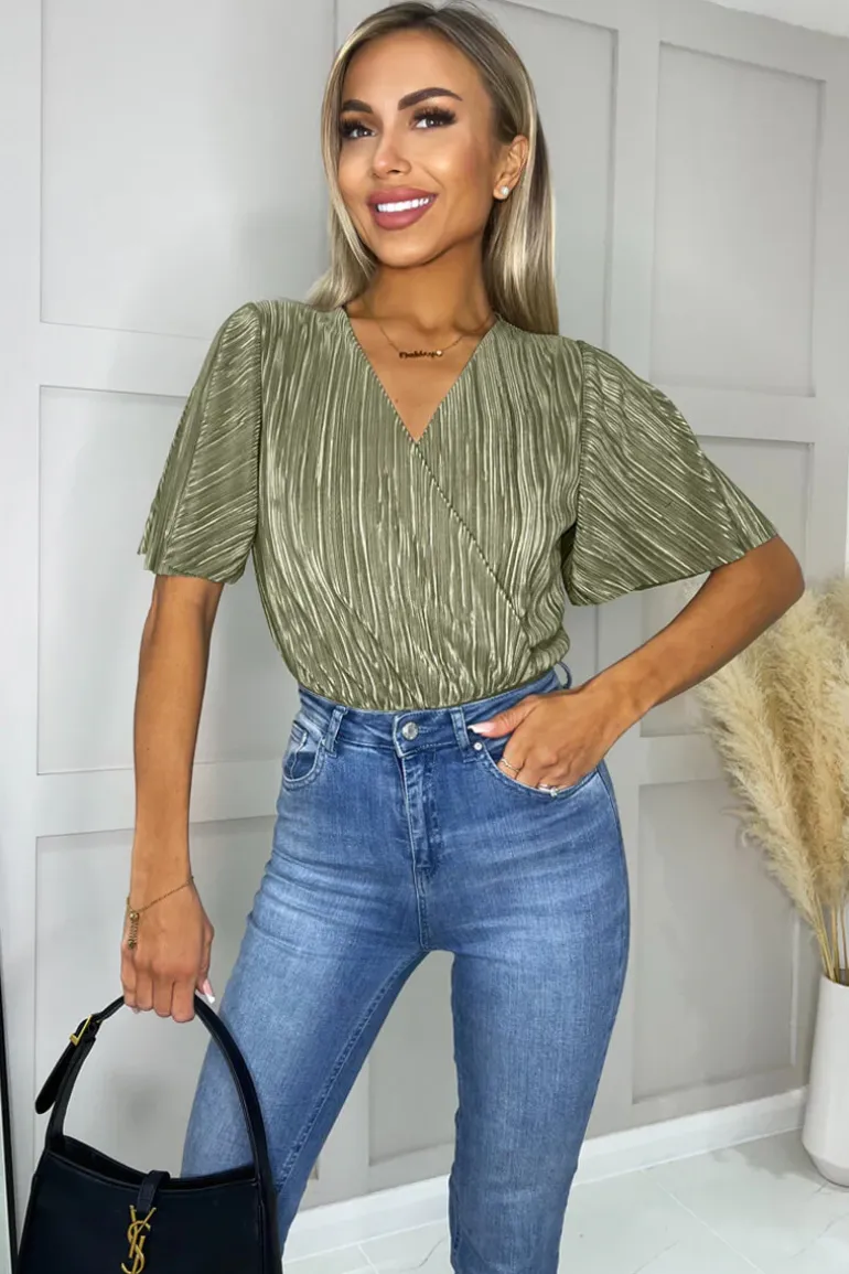 Step out in style in our Light Khaki Wrap Top Butterfly Sleeve Plisse