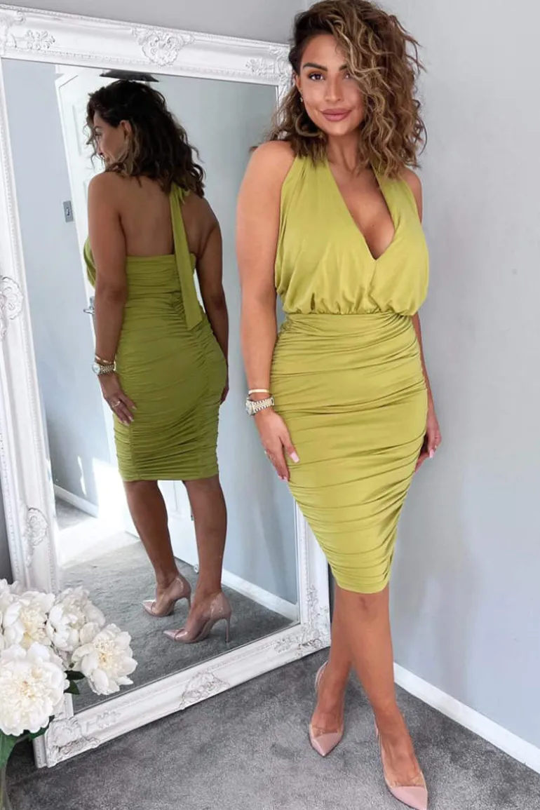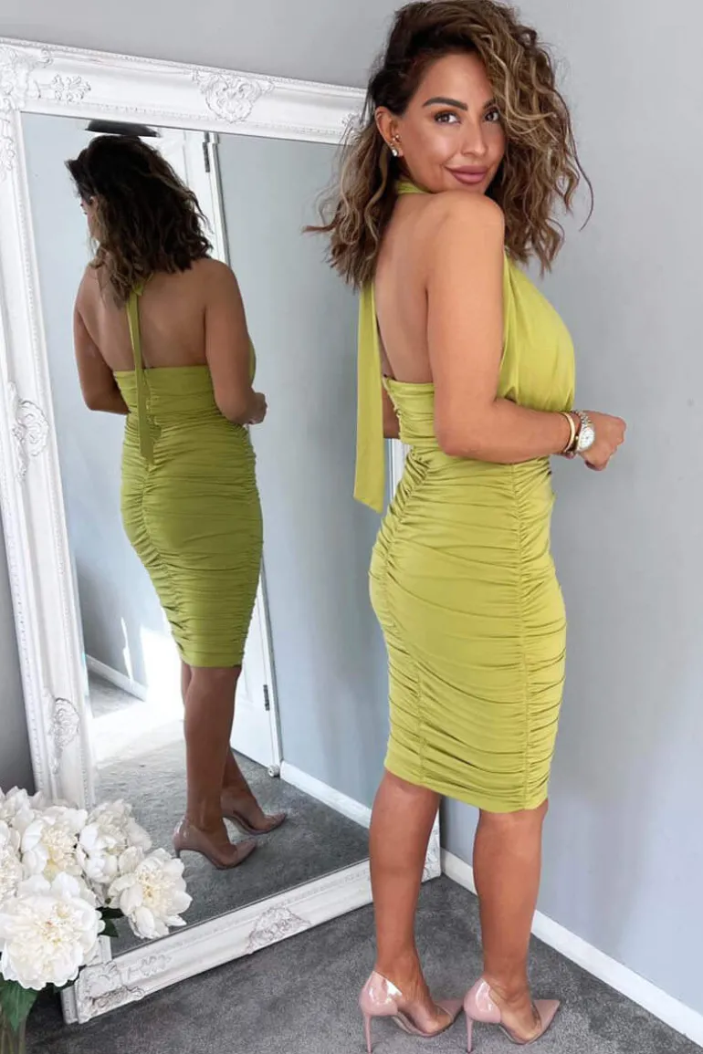 Turn heads in our Lime Halter Tie Neck Ruched Midi Bodycon Dress! This