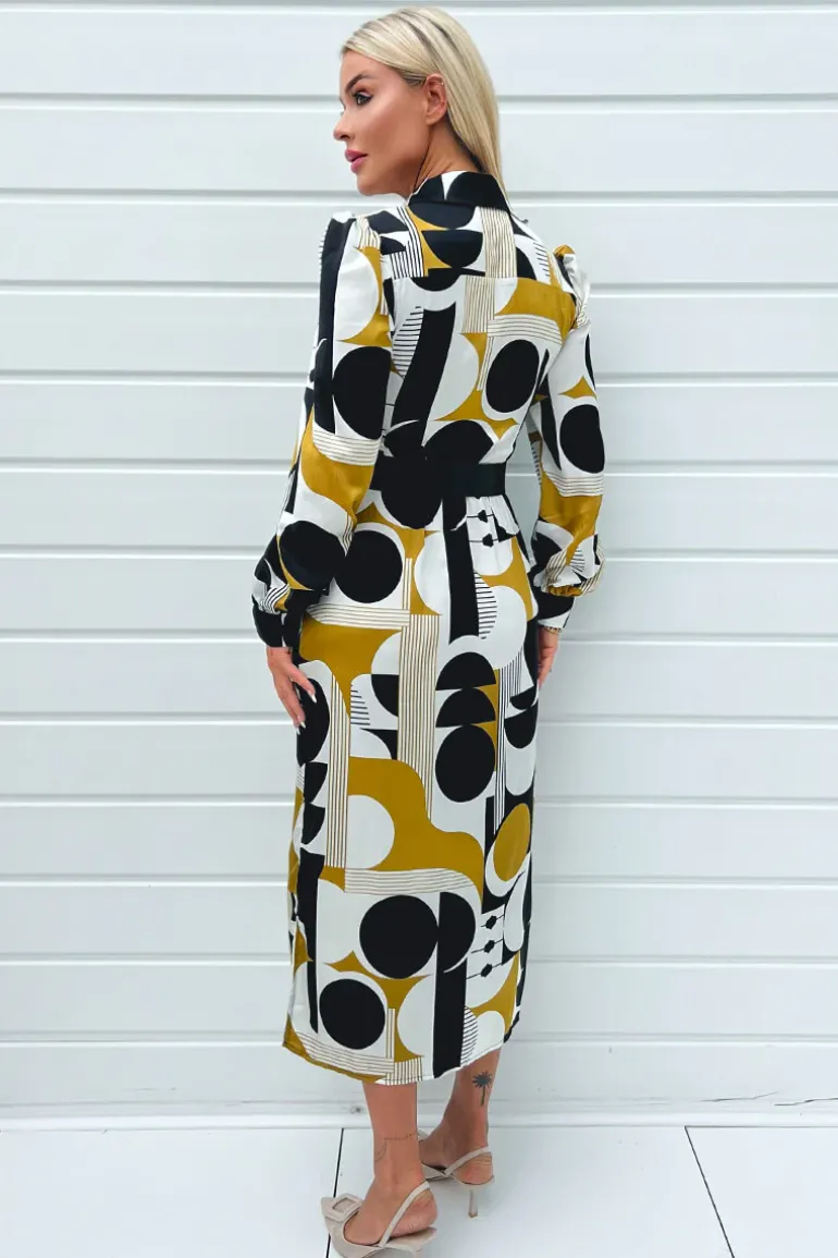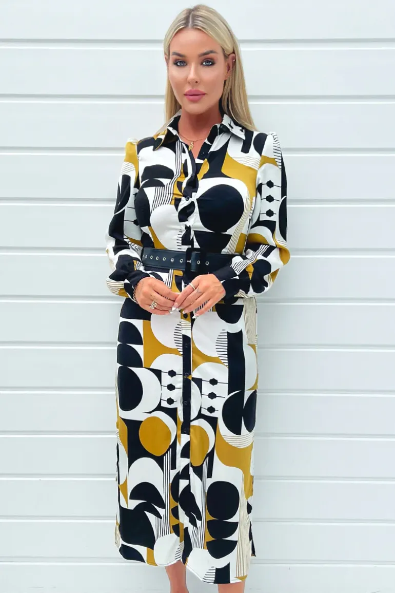 This Multi Geometric Print Button Front Belted Shirt Midi Dress is an
