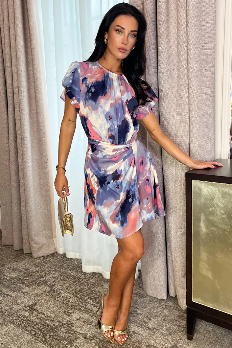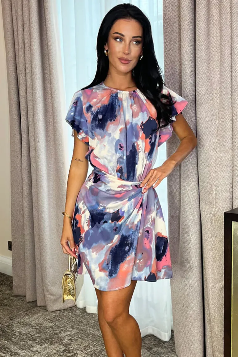 Stay on trend with our Multi Smudge Print Flutter Sleeve Gathered Side