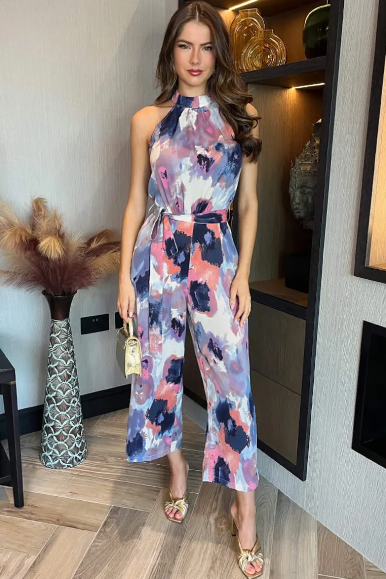 Our Multi Smudge Print Halter Neck Tie Waist Jumpsuit is the perfect