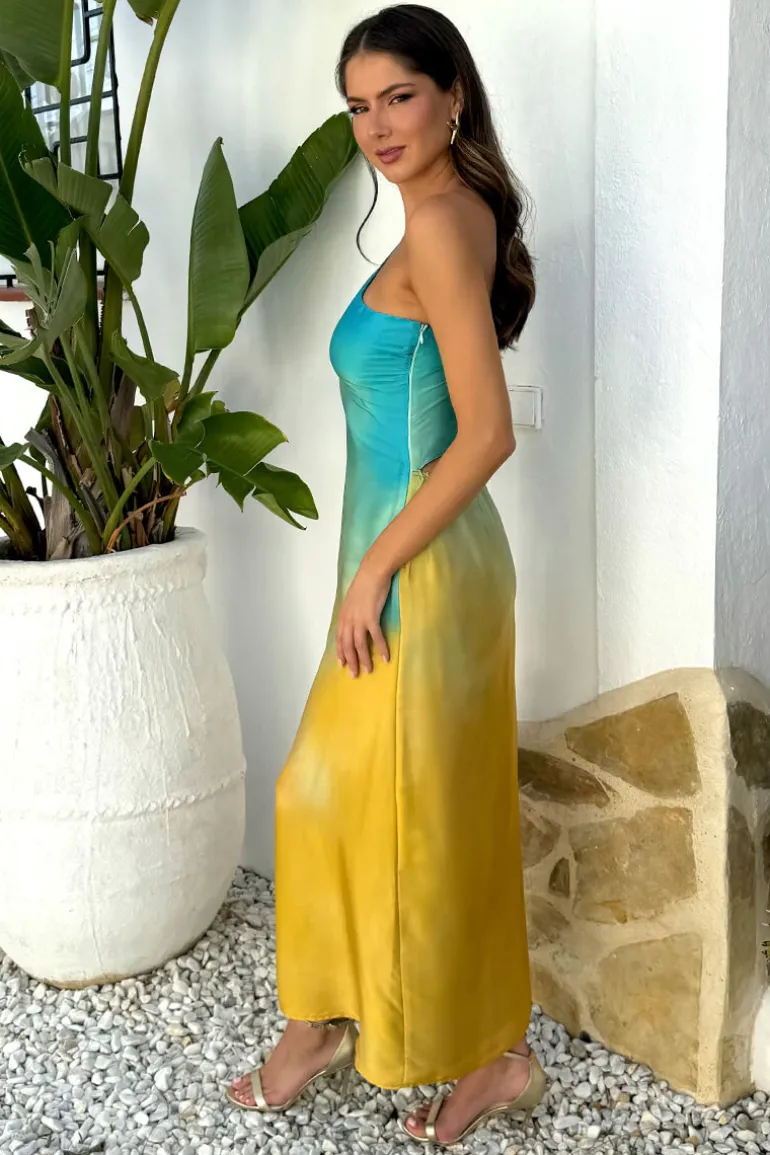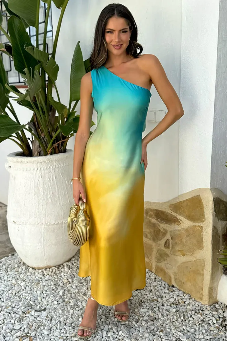 Our Multi Sunset Ombre One Shoulder Open Back Twist Detail Midi Dress