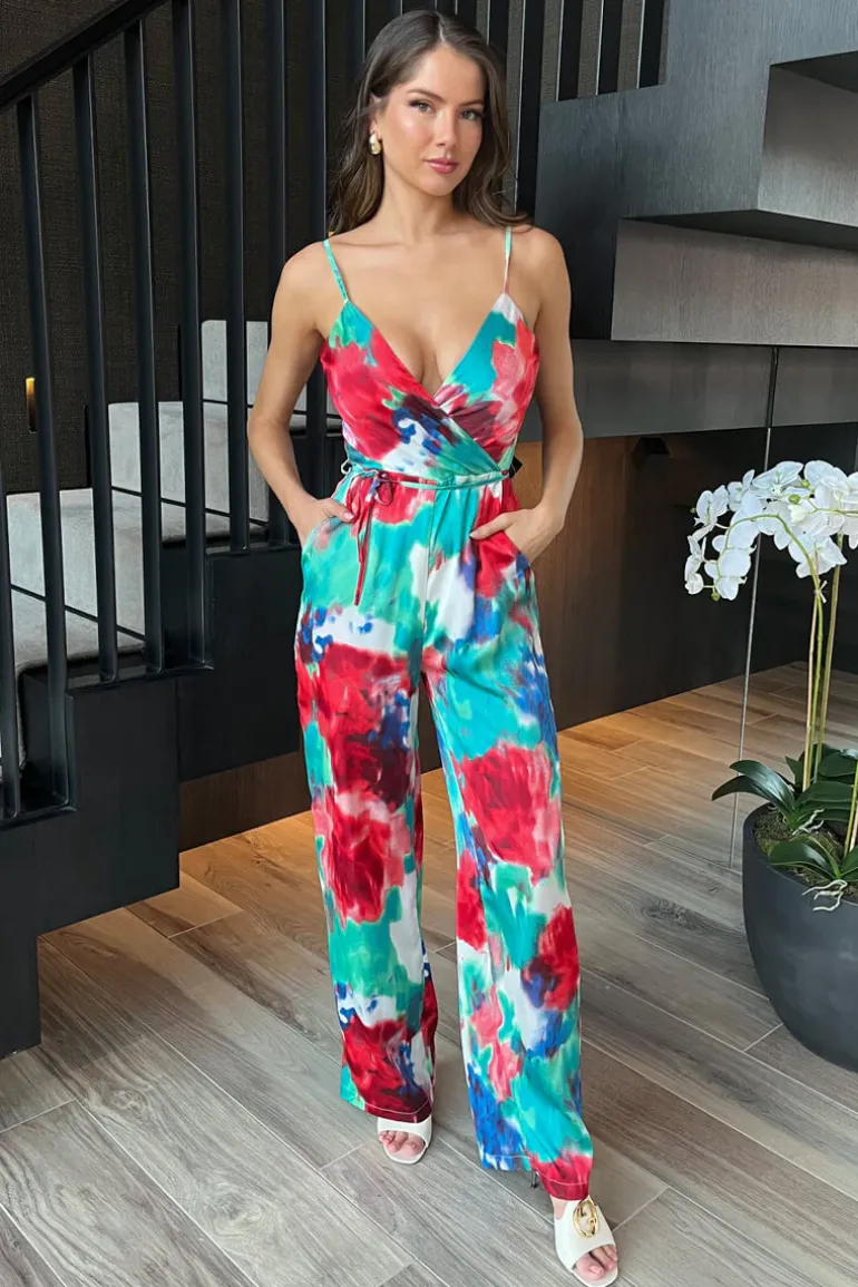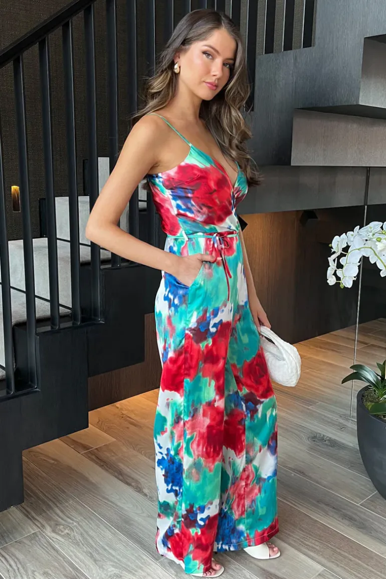 Our Multi Tie Dye Printed Strappy Tie Waist Jumpsuit is the perfect
