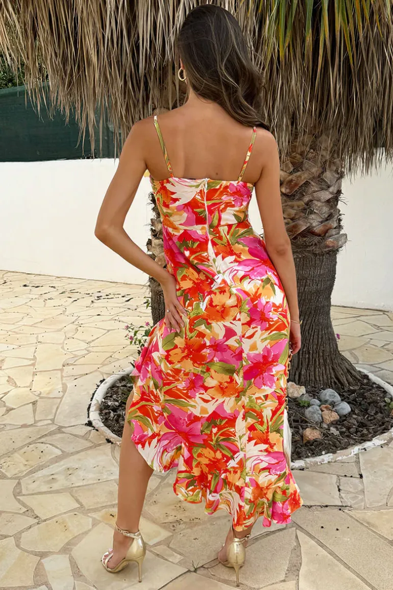 Our Multi Tropical Print Strappy High Low Frill Hem Midi Dress is the