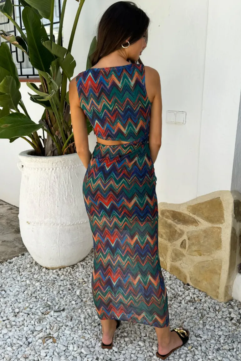 Our Multi Zig Zag Printed Mesh Asymmetric Waist Cut Out Midi Dress