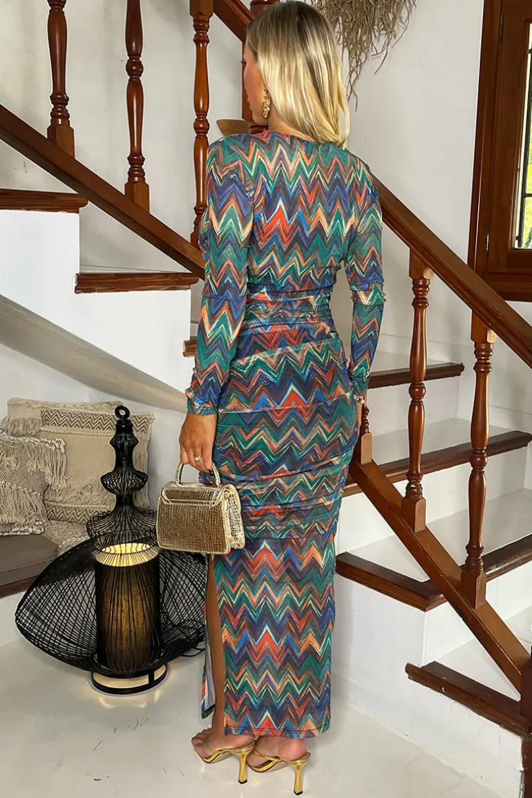 Look and feel gorgeous in our Multi Zig Zag Printed Mesh Overlay Long