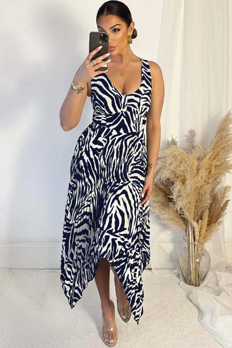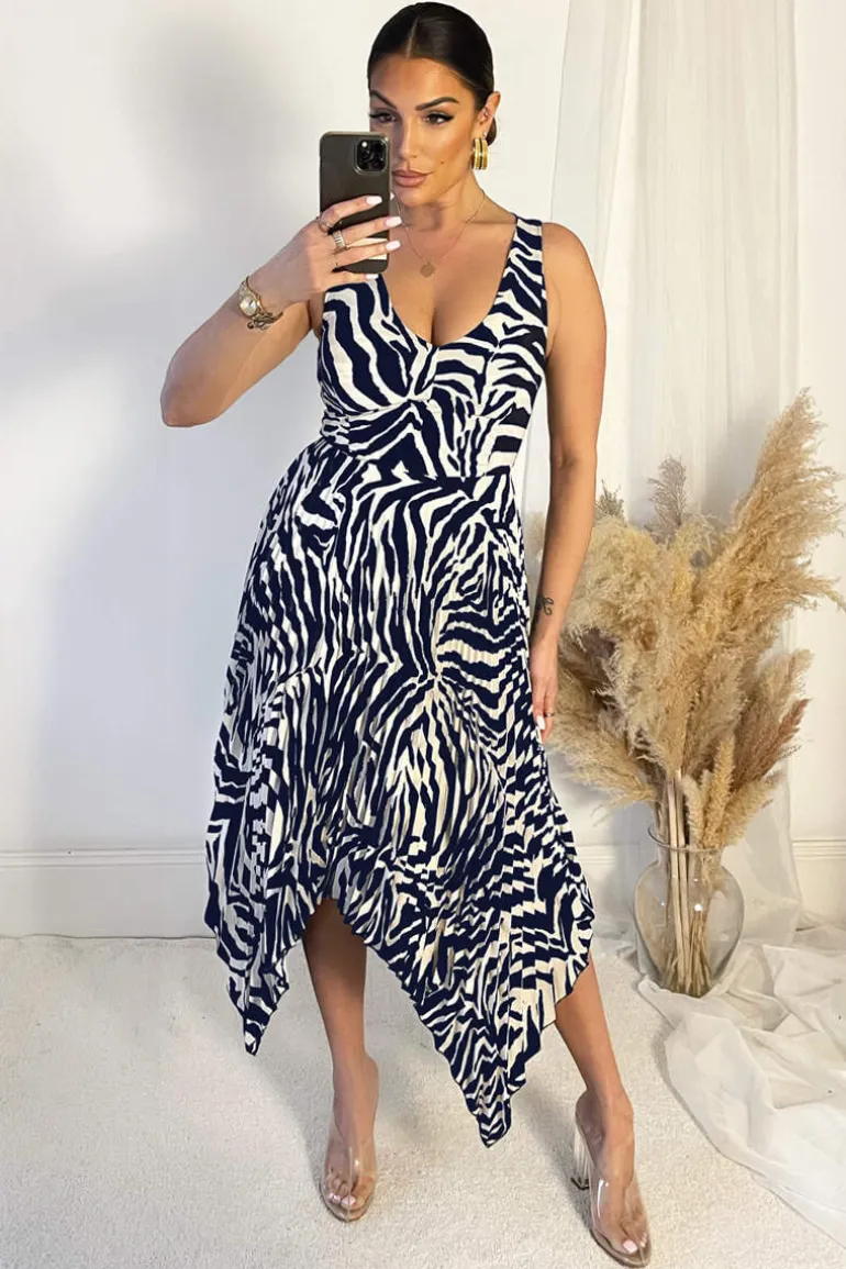 Our Navy And Cream Printed V Neck Zig Zag Hem Pleated Midi Dress is