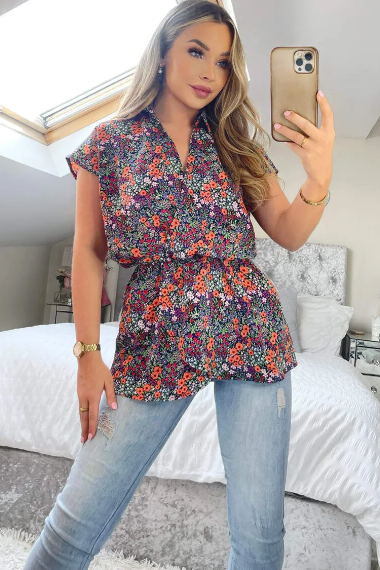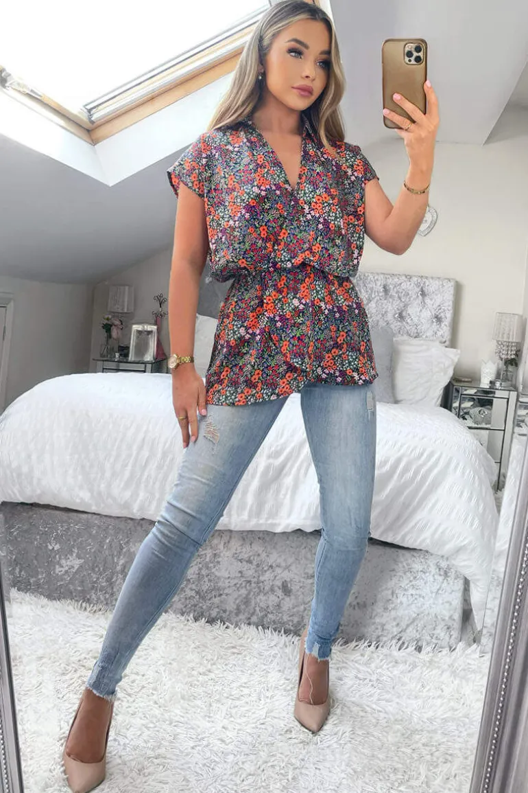 Our Navy and Orange Floral Print Wrap Top is perfect to dress up or