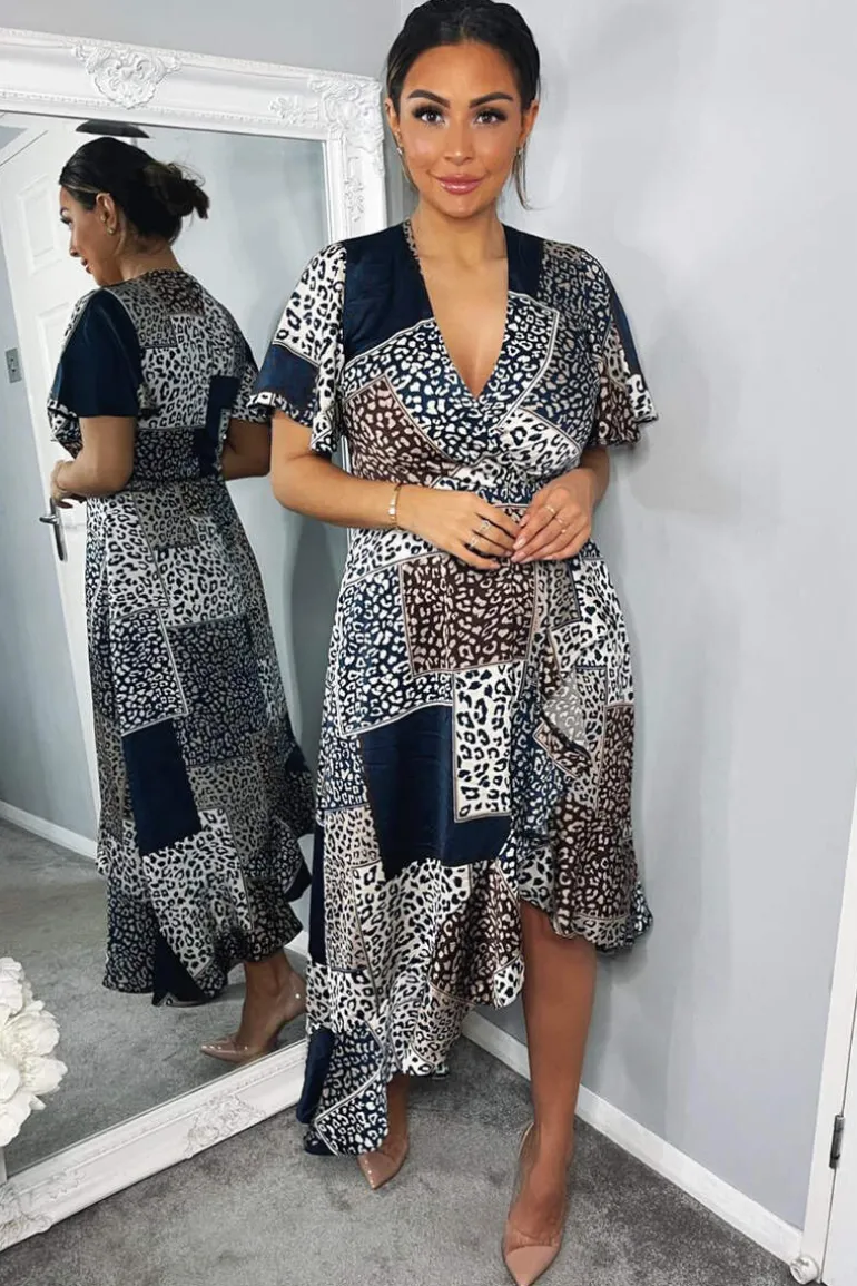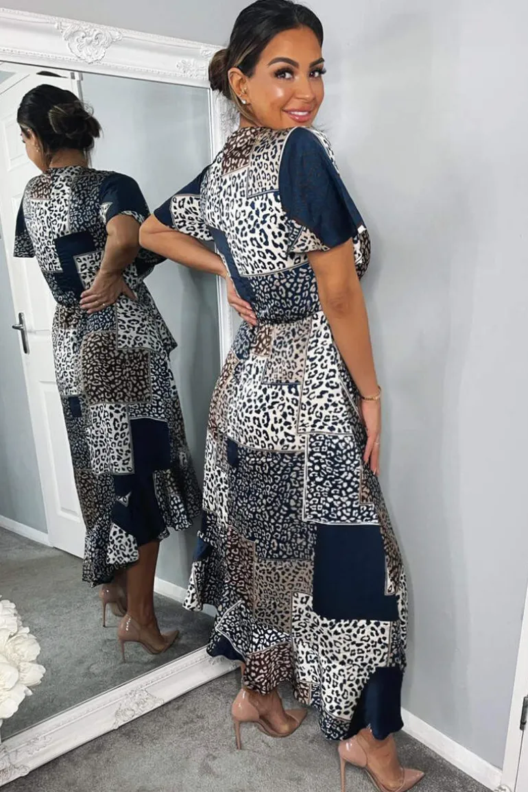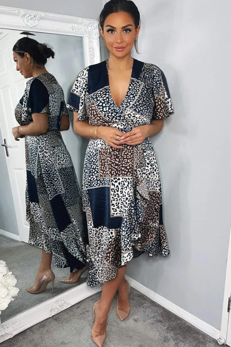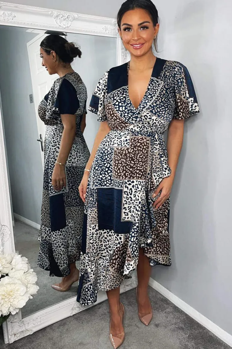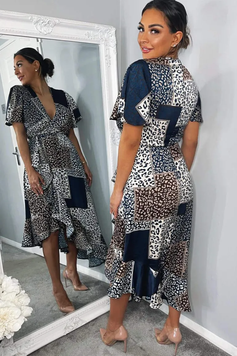 Our Navy Animal Print Patchwork Wrap Midi Dress is the perfect