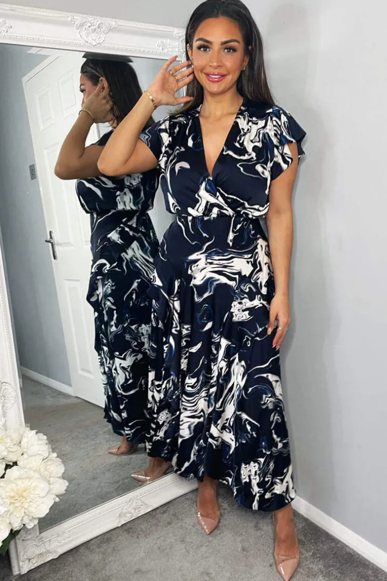 Our Navy Marble Print Short Sleeve Ruffle Midi Dress is right on trend
