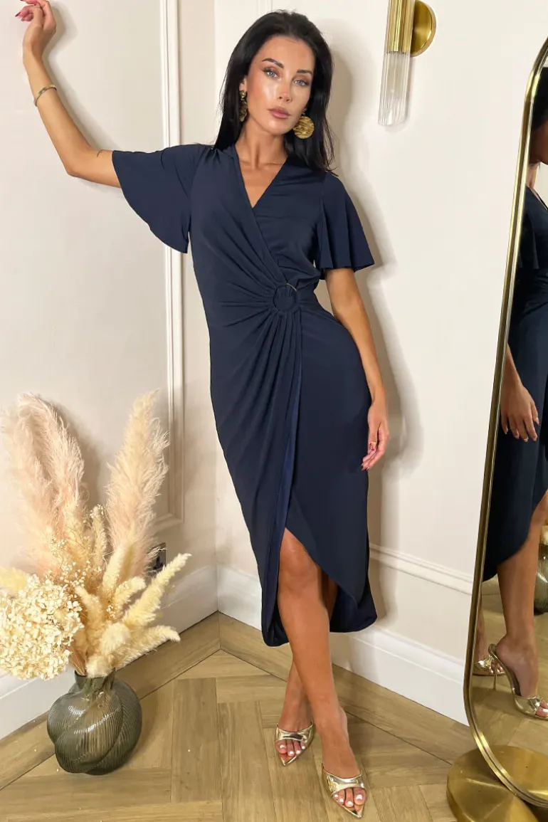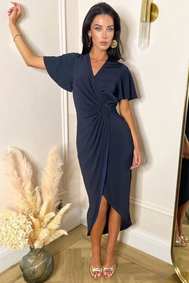 Our Navy Short Sleeve Ring Detail Wrap Midi Dress is an occasion