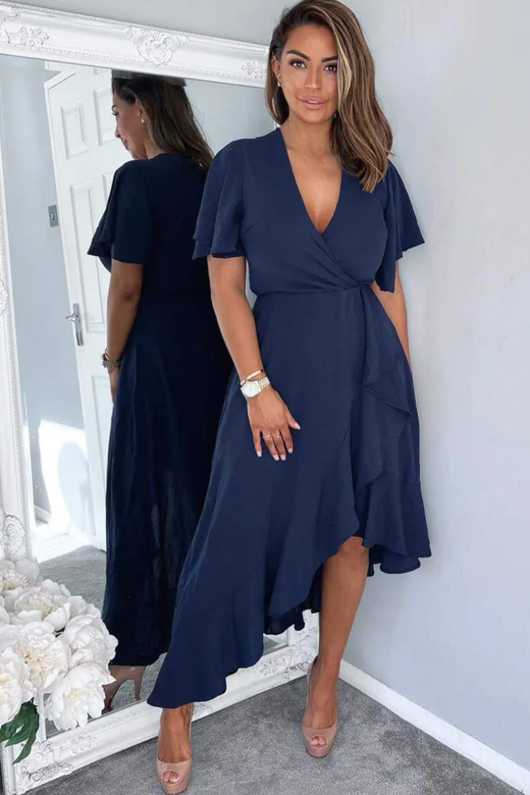 Our Navy Wrap Over Top Frill Hem Midi Dress is the perfect occasion