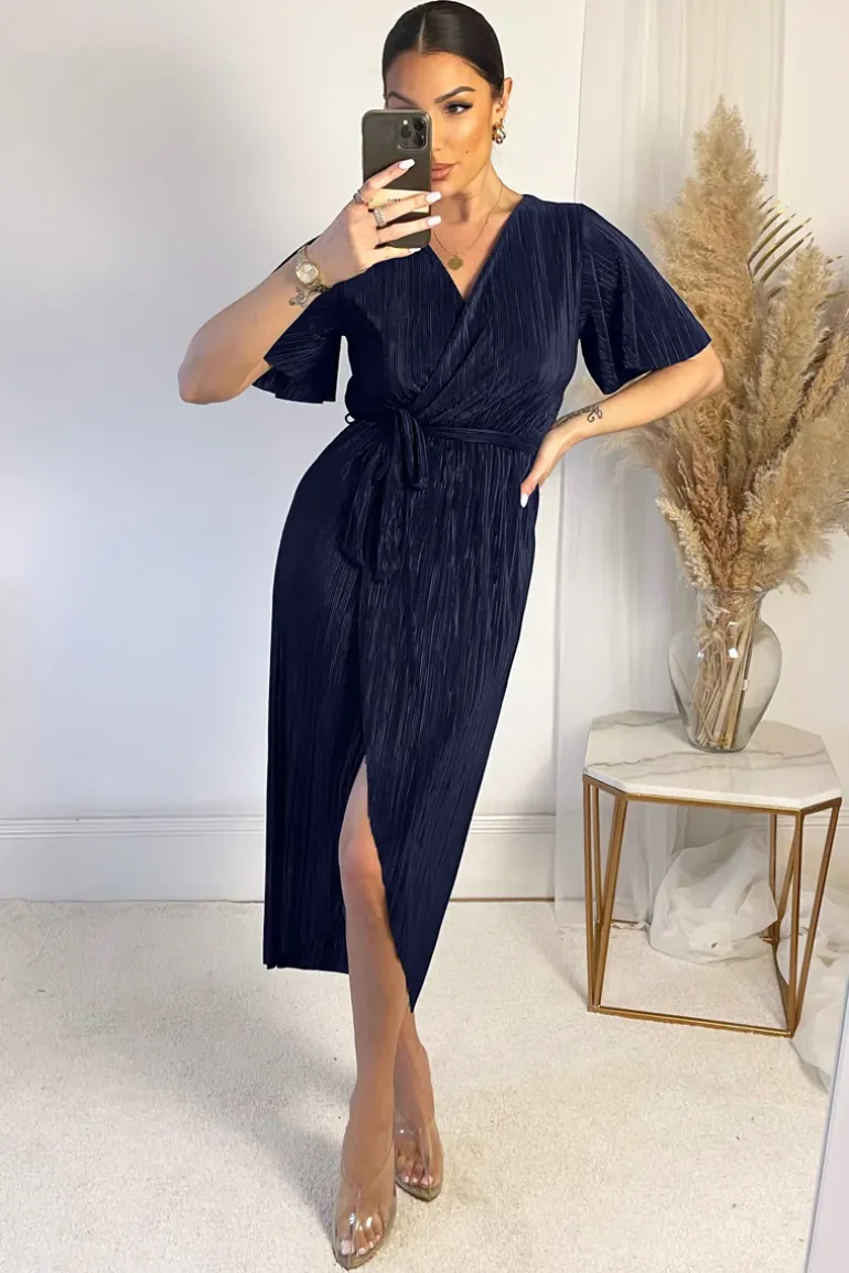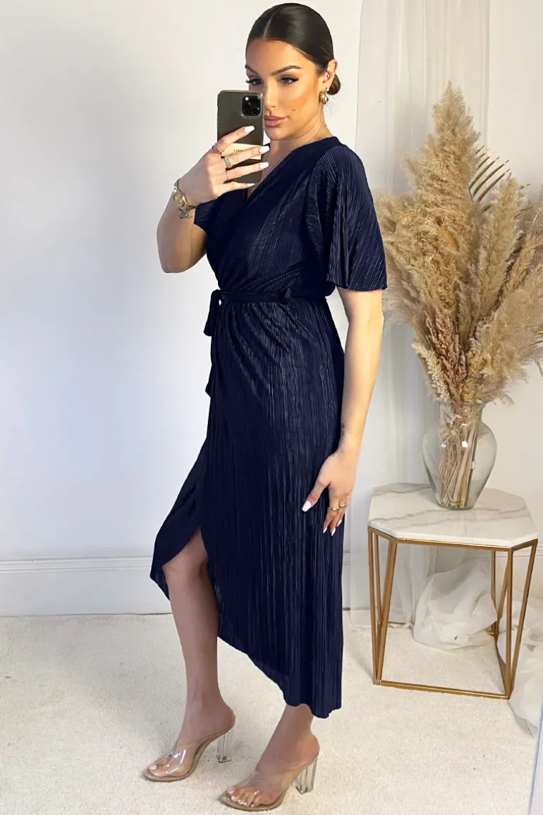 Our Navy Wrap Top Belted Short Sleeve Plisse Midi Dress is a wardrobe