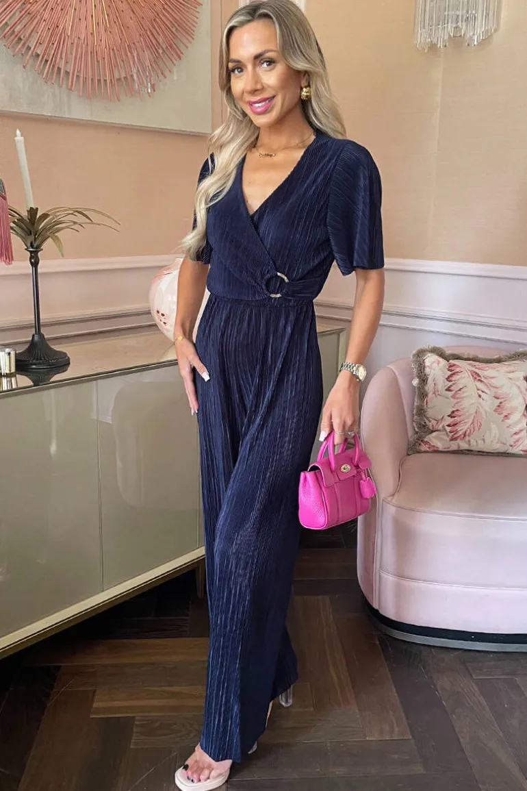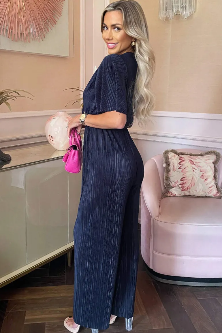 Our Navy Wrap Top Short Sleeve Plisse Jumpsuit is the perfect