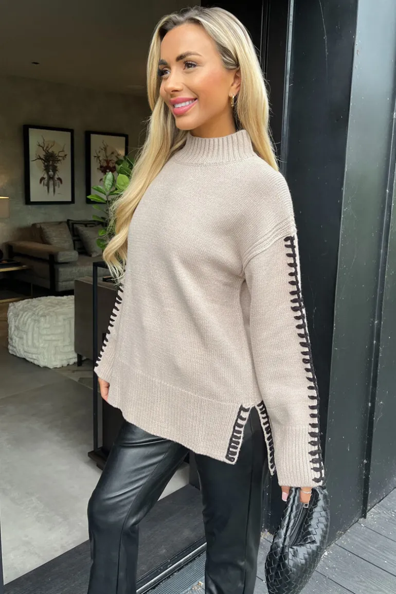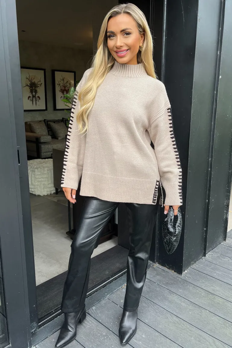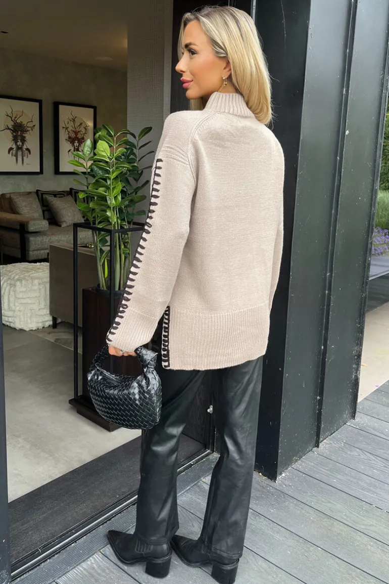 Refresh your winter wardrobe with our Oatmeal Mock Neck Blanket Stitch