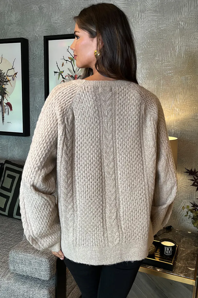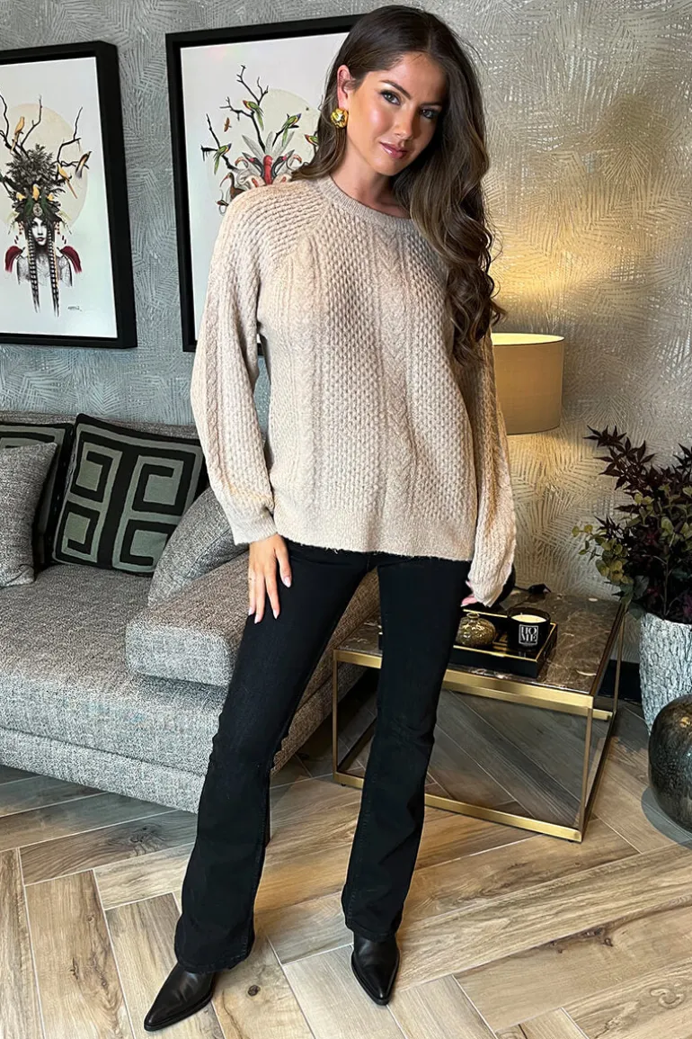 Stay cosy this winter in our Oatmeal Round Neck Cable Knit Jumper.