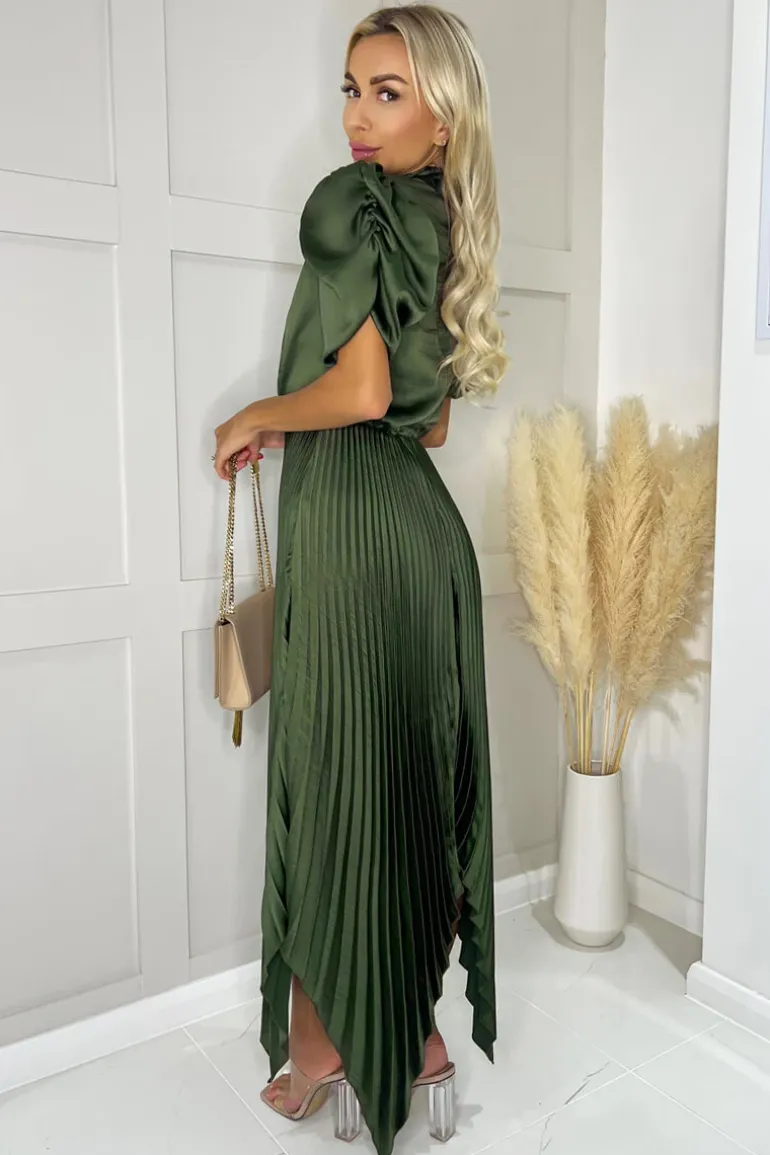 Our Olive High Neck Puff Sleeve Zig Zag Hem Pleated Midi Dress is the