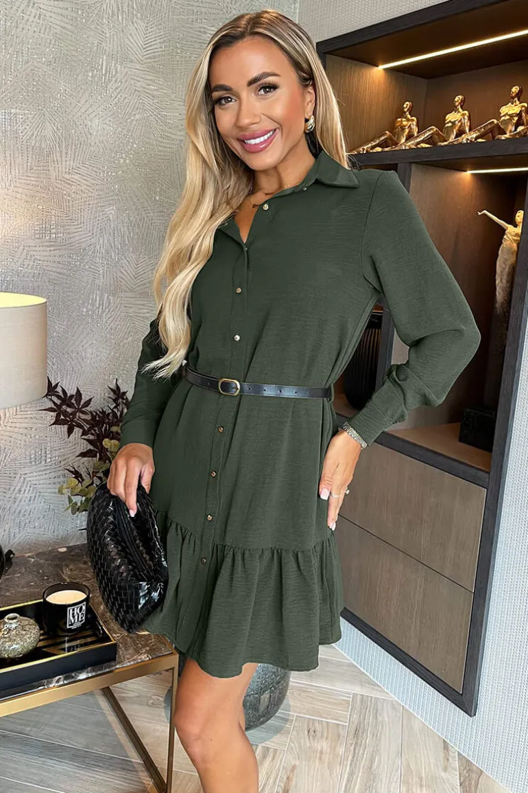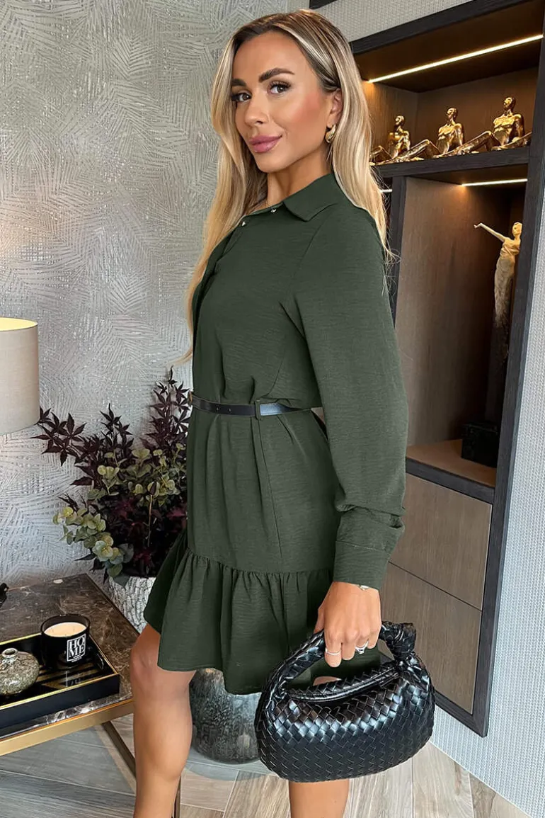 This Olive Long Sleeve Frill Hem Shirt Mini Dress is a must have this