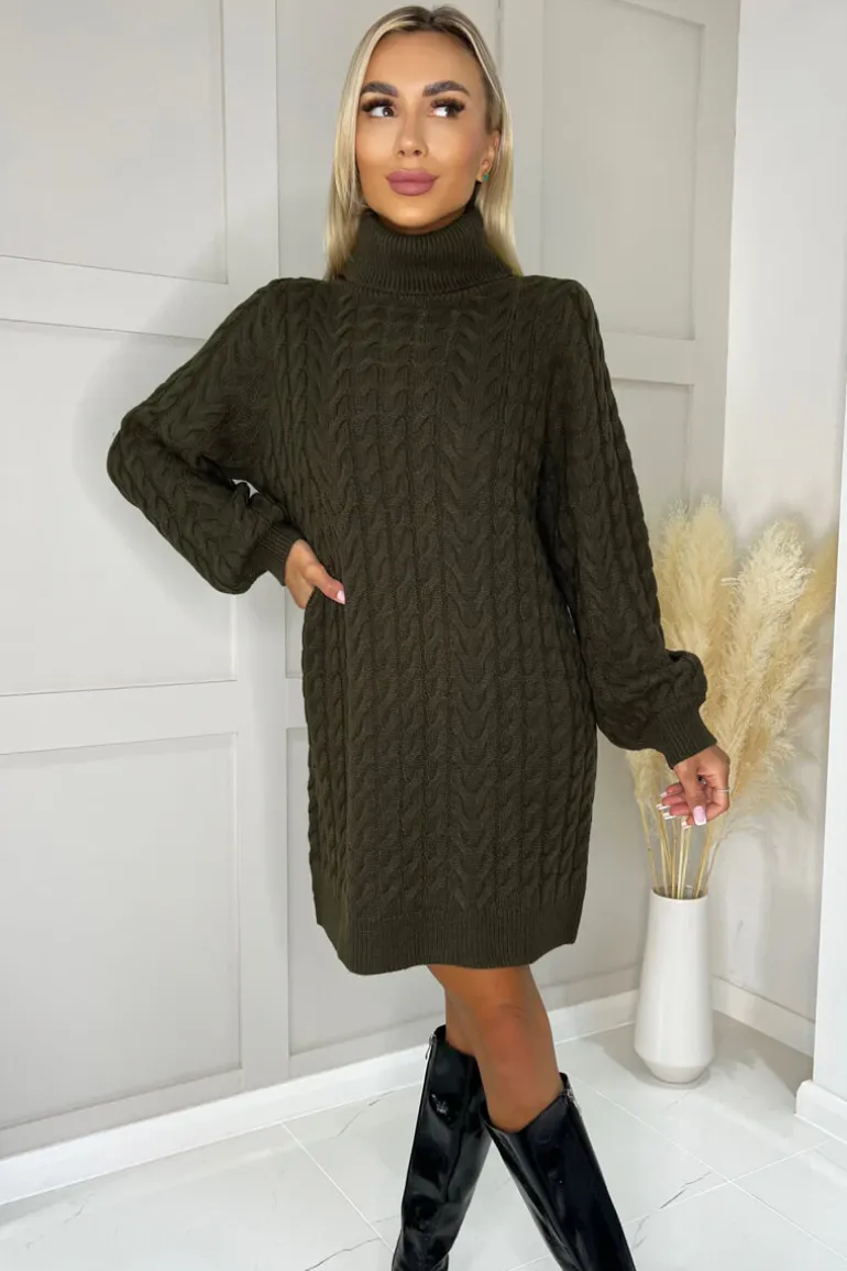 Look great in our Olive Roll Neck Cable Knit Dress the perfect edition