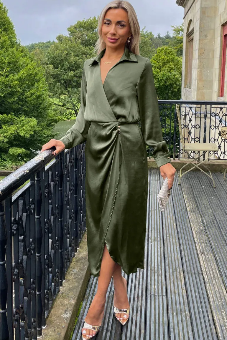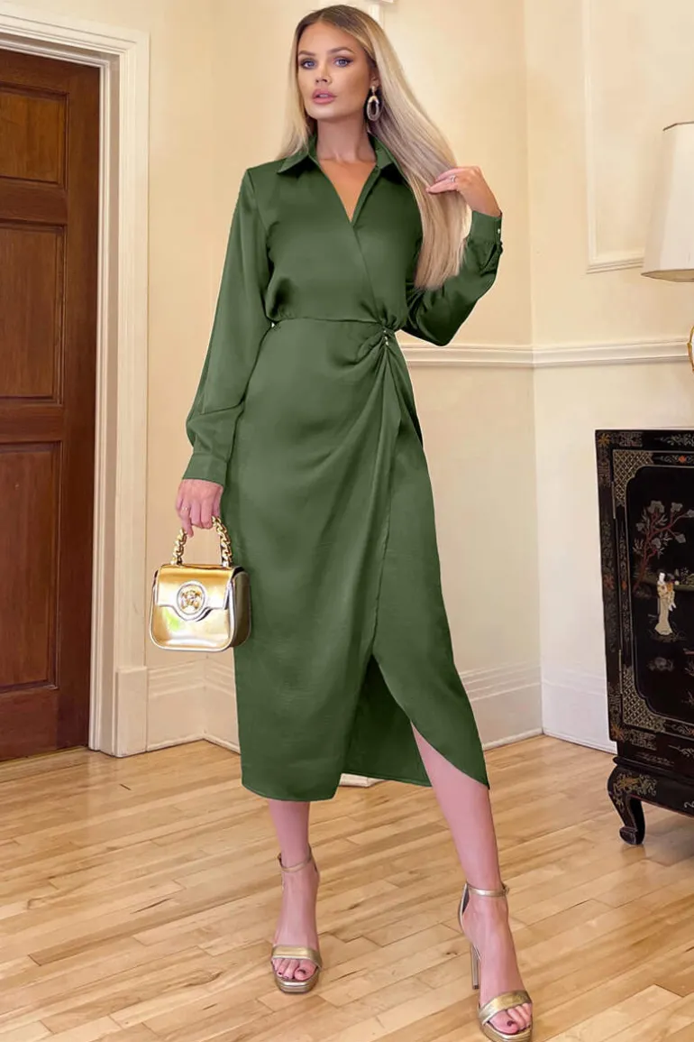 This Olive Wrap Satin Shirt Midi Dress is a must have this season!