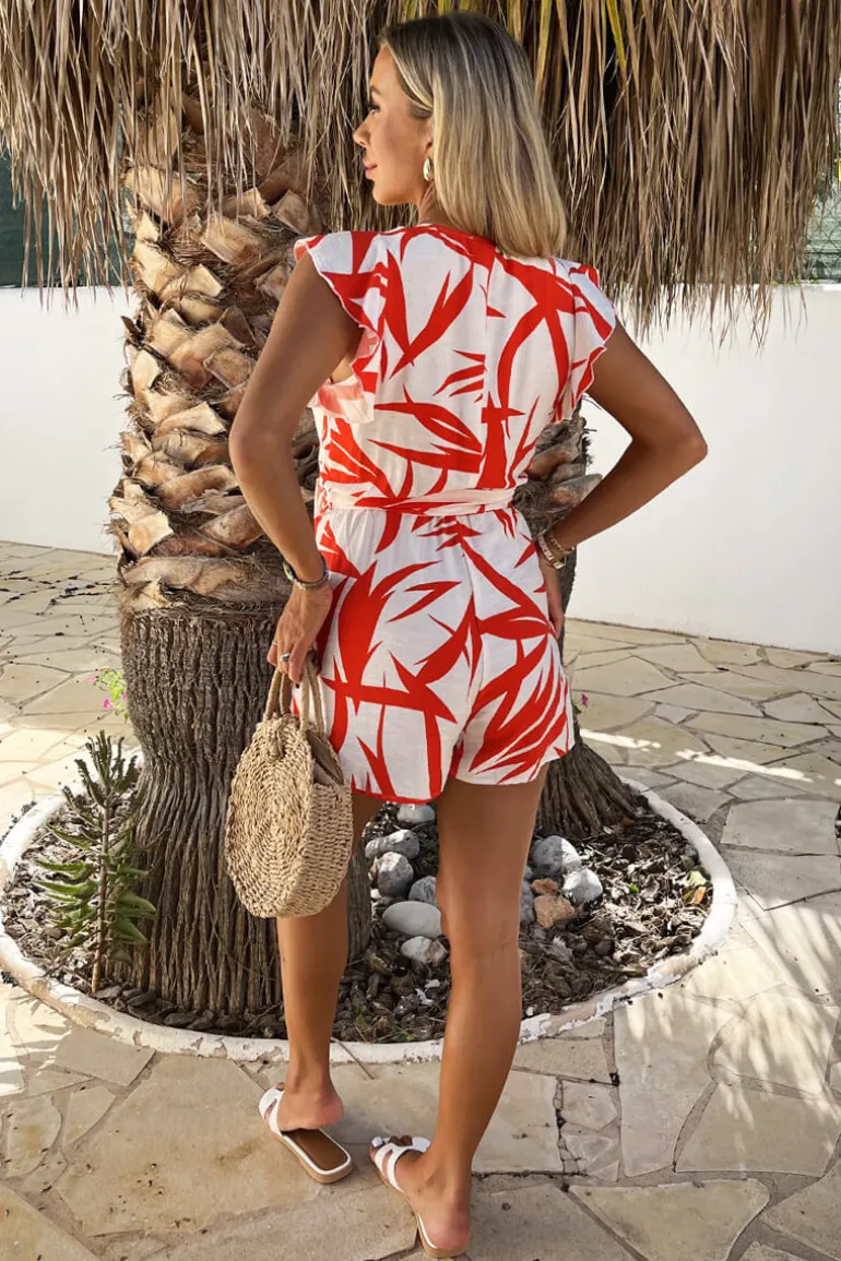 Our Orange And Cream Tropical Print Wrap Top Tie Waist Playsuit is a
