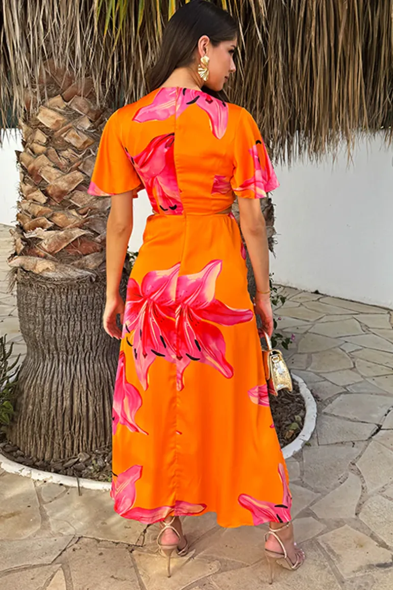 Our Orange And Pink Floral Print V Neck Cut Out Knot Detail Midi Dress