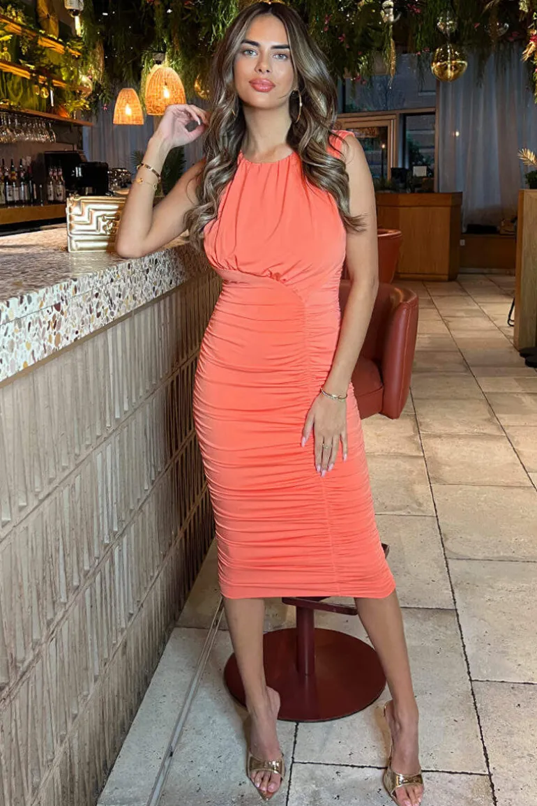 Our Peach Ruched Bodycon Midi Dress is the perfect summer occasion