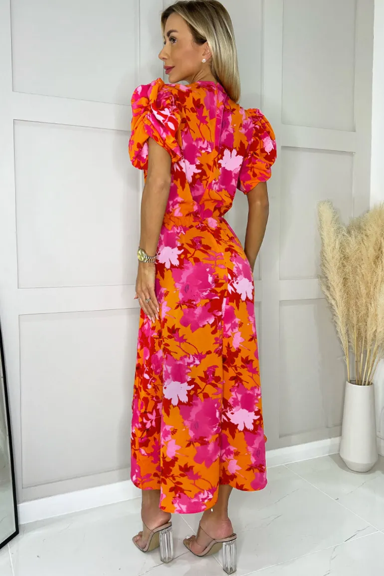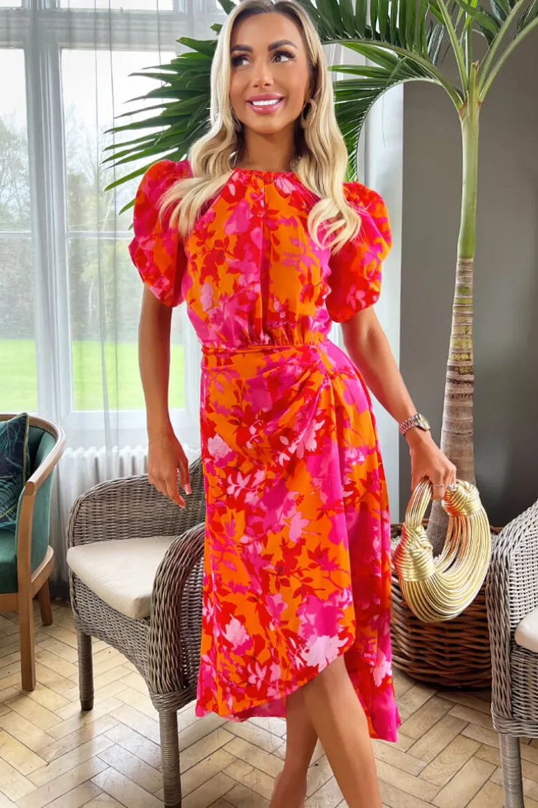 Stay on trend with this Pink And Orange Floral Printed Short Puff