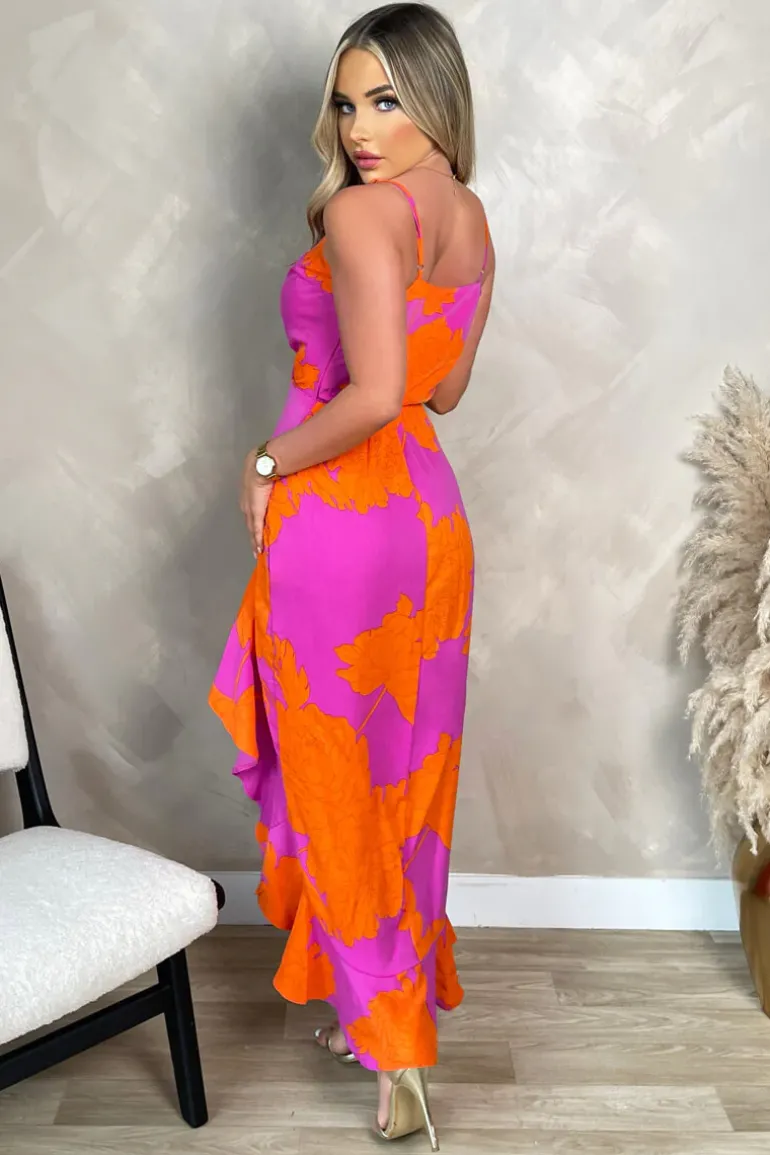 Our Pink And Orange Floral Printed Wrap Over Strappy Midi Dress is