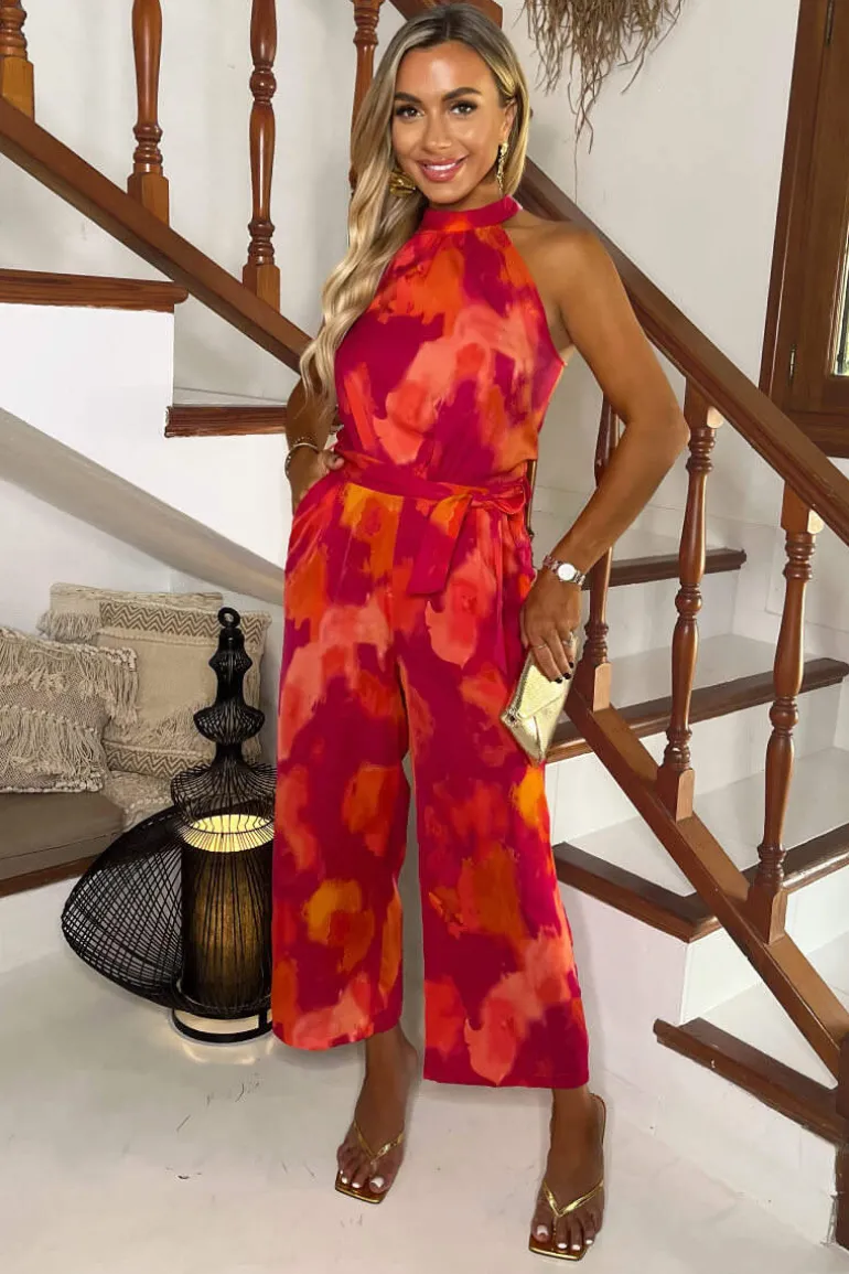 Our Pink And Orange Smudge Print Halter Neck Tie Waist Jumpsuit is