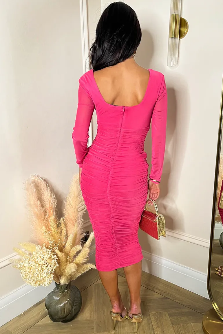 Contour your body in our Pink Square Neck Long Sleeve Ruched Bodycon