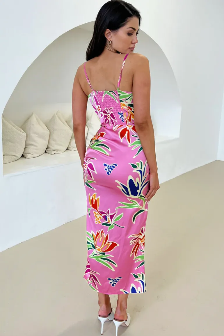 Embrace your glamorous side with our Pink Tropical Print Cowl Neck