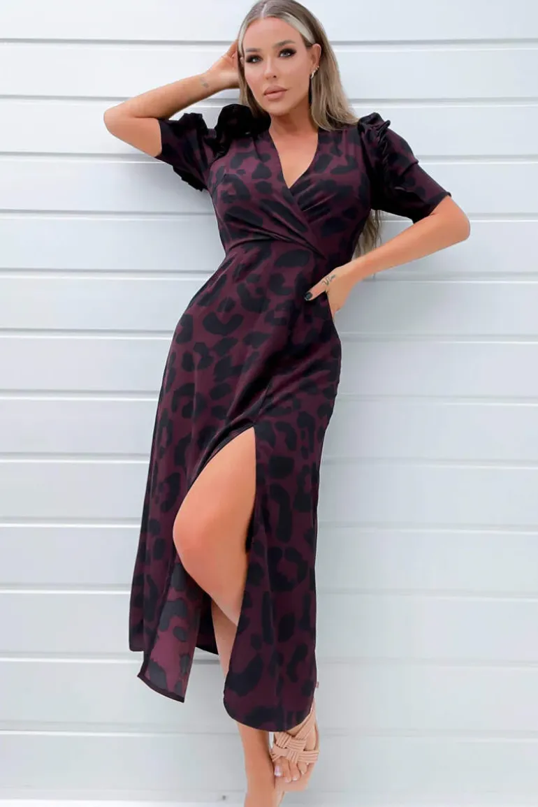 Look sophisticated in our Plum Animal Print Pleated Sleeve Midi Dress.