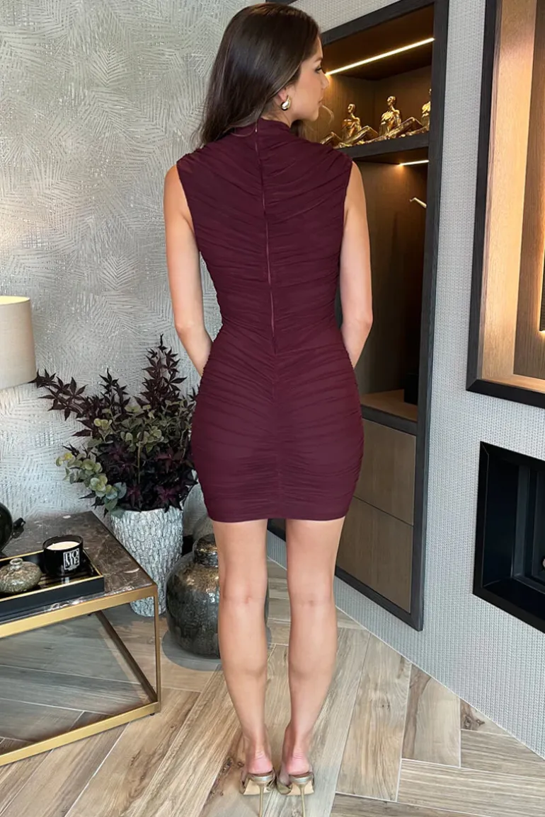 Our Plum High Neck Bodycon Ruched Mesh Mini Dress is perfect for