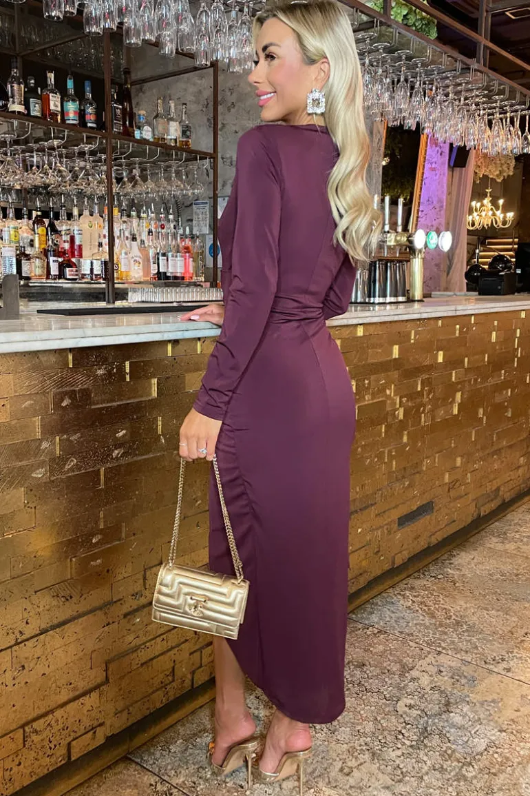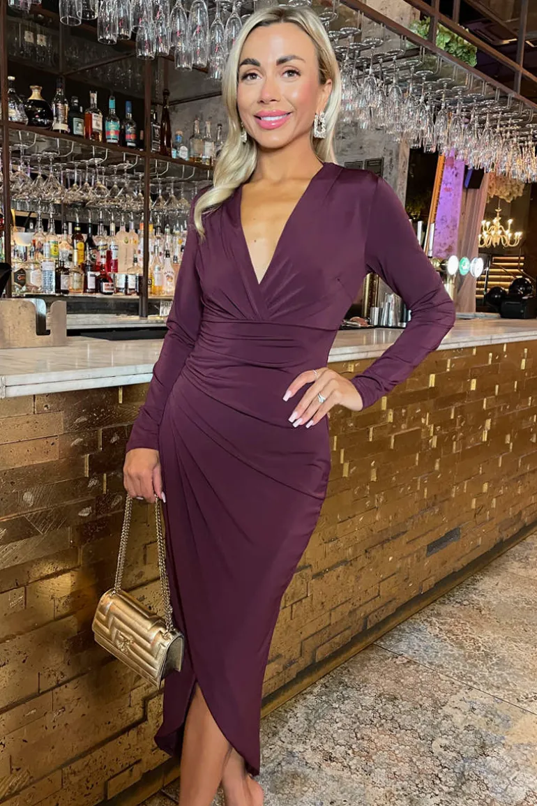 Classy and timeless, our Plum Long Sleeve Wrap Midi Dress is