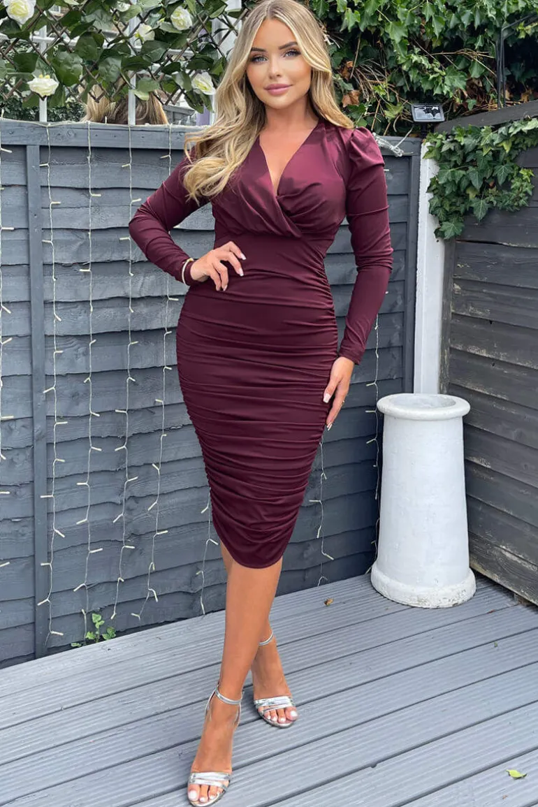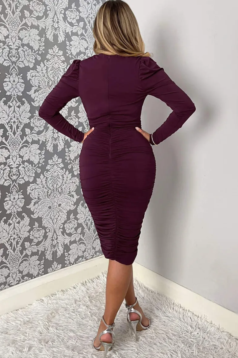 Our Plum Ruched Long Sleeve Cross Front Midi Dress will have you