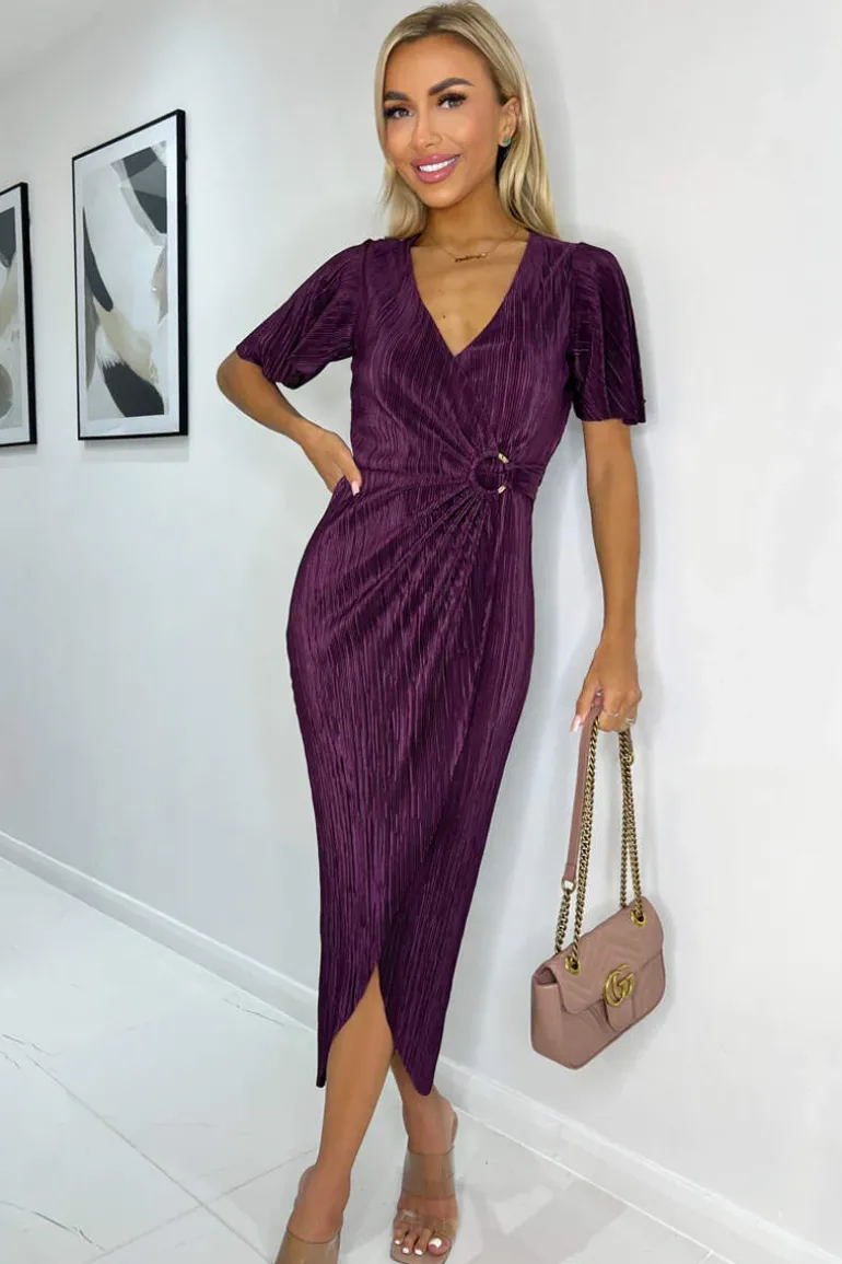 Our Plum Short Sleeve Plisse Wrap Midi Dress is a wardrobe must have.