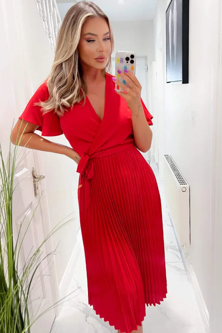 We can’t get enough of this Red Belted Pleated Skirt Midi Dress!