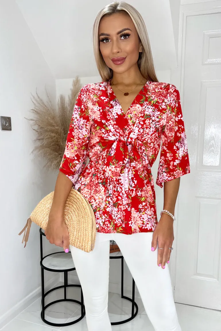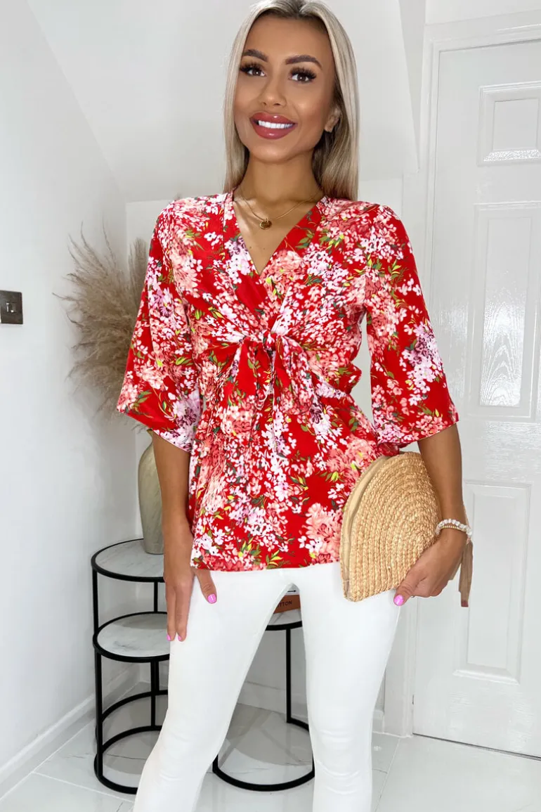 Our Red Floral Front Tie Wrap Top is the ideal piece to add to your