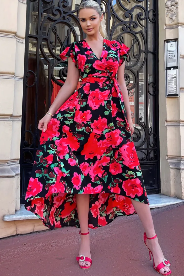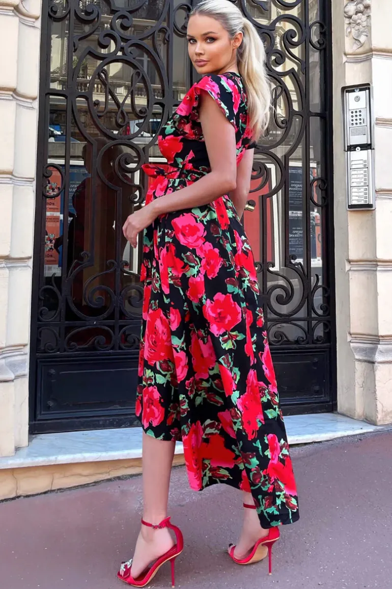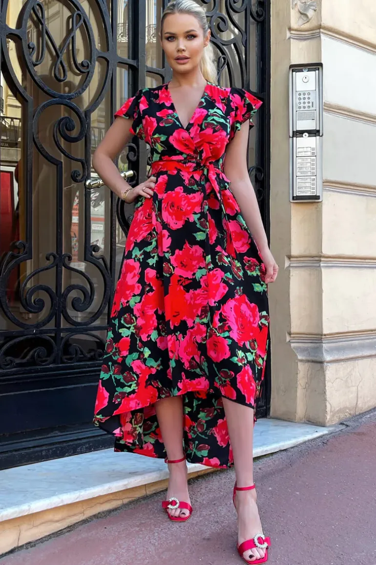 Stay sophisticated in this Red Floral Print Short Sleeve Belted Wrap