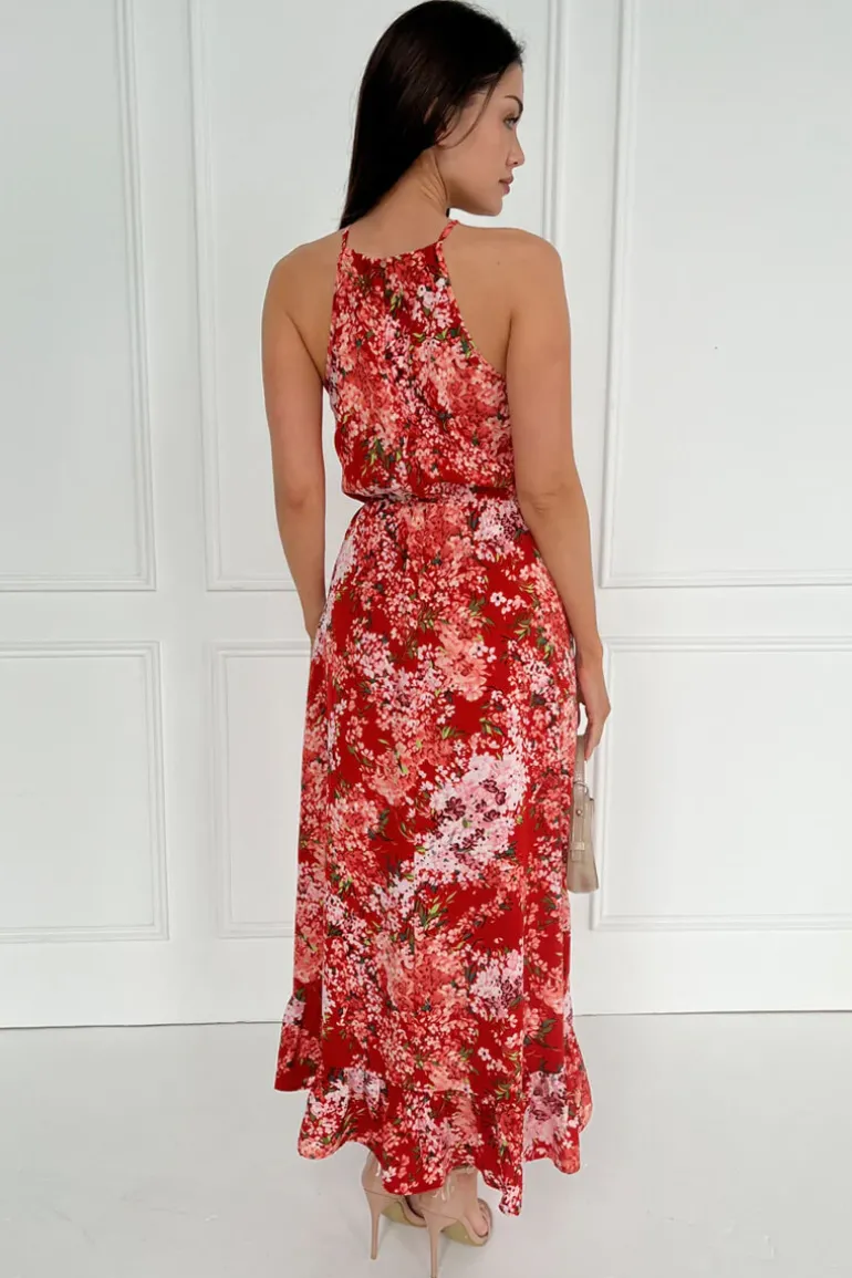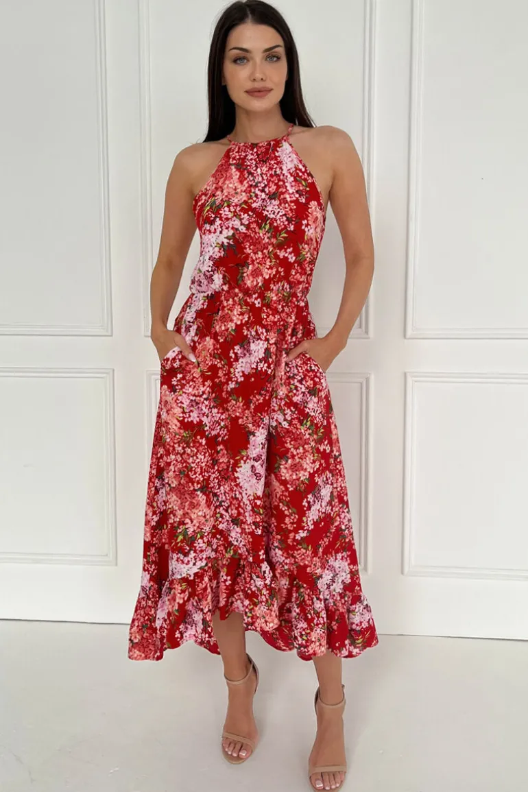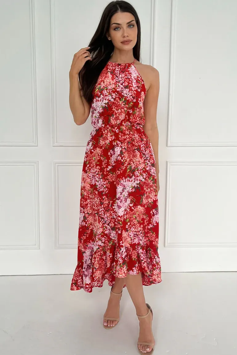 Our Red Floral Printed Frill Hem High Neck Midi Dress is perfect for