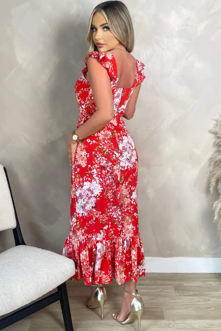 Our Red Floral Printed Frill Strap Midi Dress is right on trend this