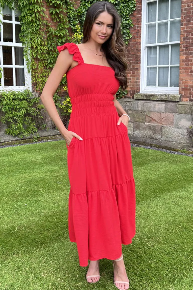 Our Red Frill Strap Tiered Midi Dress is right on trend this season!