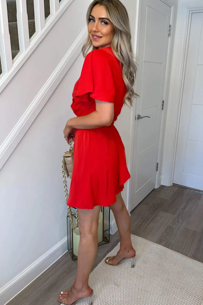 Stay cute in our Red Wrap Over Belted Skater Dress With Short Sleeves.