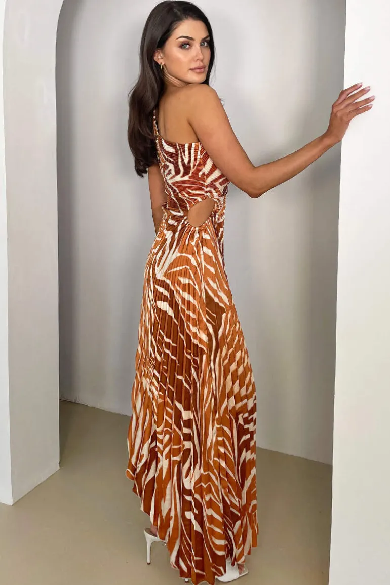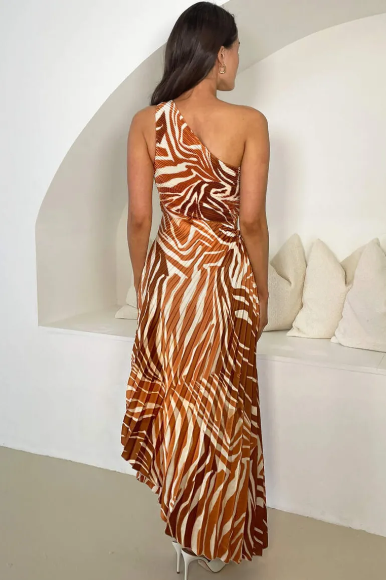 Our Rust Printed One Shoulder Pleated Midi Dress is the perfect