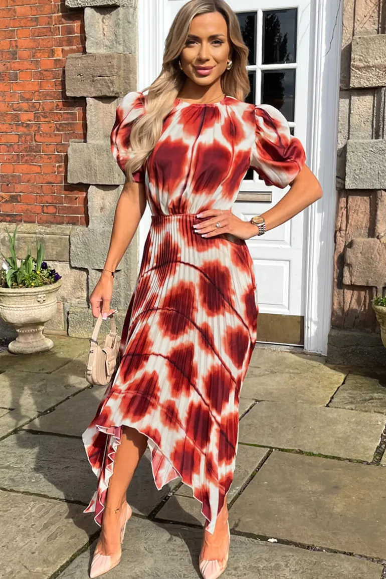 Our Rust Printed Puff Sleeve Zig Zag Hem Pleated Midi Dress is the