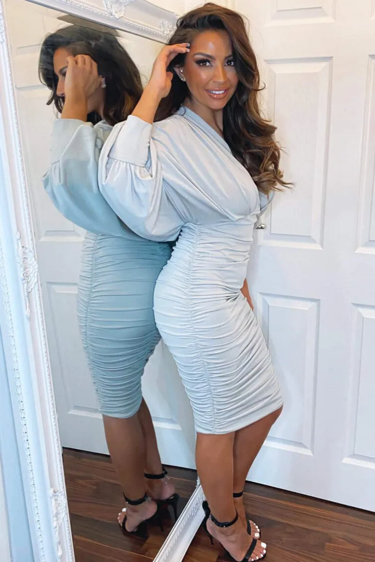 This Silver Ruched Bat Wing Sleeve Midi Dress is perfect for a formal